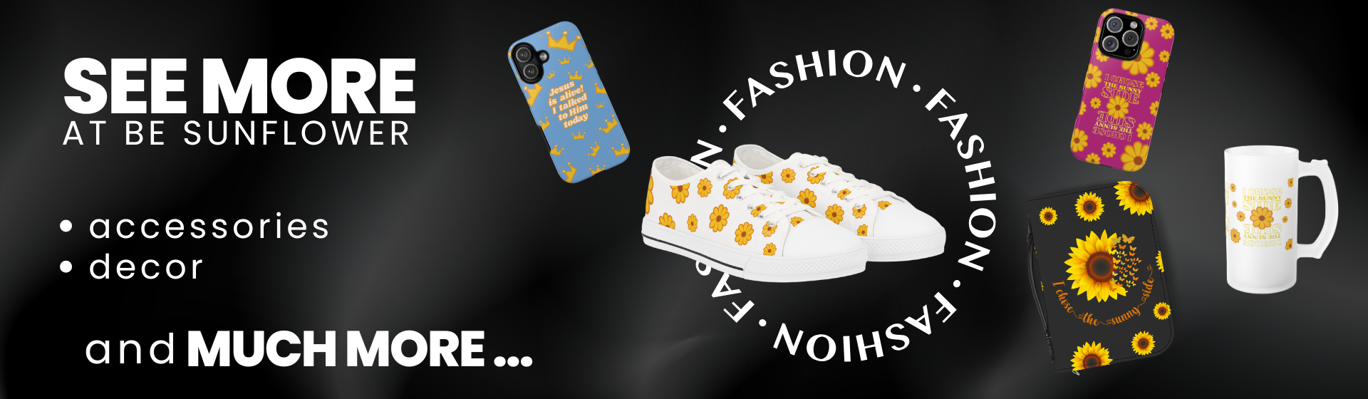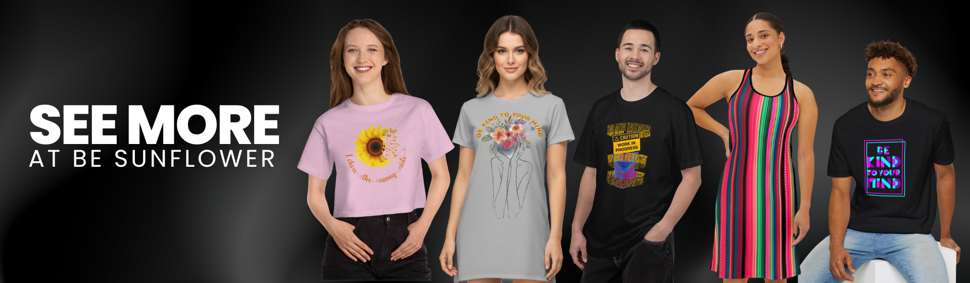 Be Sunflower is an inspiring clothing brand that offers printed t-shirts and everyday pieces with beautiful, fun, and casual prints — especially designs that convey messages of faith, positivity, and support for mental health. Made for comfort, made for all styles, and also to inspire conversations, many of their clothes are a gentle reminder to shine, grow, and choose kindness. Wear your sunshine.